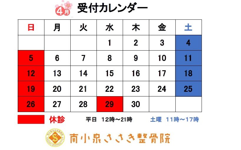 南小泉ささき整骨院の4月度予定に関しましては